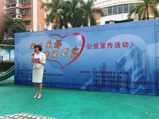 按照汕头市质量技术监督局“2018年特种设备安全生产月和安全生产万里行活动”的部署,汕头检测院联合汕头市电梯协会于2018年6月9日下午,分别在汕头中信物业有限公司中信海滨花园、广东龙光集团物业管理有限公司阳光海岸两个社区承办了“安全乘梯、幸福万家”、“安全乘梯、幸福随行”电梯安全进社区及观摩电梯困人应急救援演练系列公益宣传活动。市质监局局长蔡榕、党组书记蔡向鸿、副调研员郭仁校、特监科及各区县局相关领导出席了活动,蔡榕局长作了重要讲话。