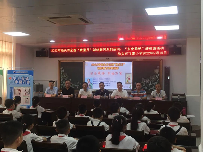根据市市场监督管理局2022年“质量月”和“电梯安全宣传周”活动的工作要求,为推广普及电梯安全知识,增强社会公众电梯安全意识,把电梯安全知识送进校园,培养引导广大青少年学生正确使用电梯、安全文明乘梯的良好习惯。针对学生求知欲强、善于接受新鲜事物、模仿能力强等特点,9月19日在市市场监管局的指导下,金平区市场监管局联合汕头检测院、市特种设备协会、广东菱越电梯有限公司在飞厦小学开展以“安全乘梯 幸福万家”为主题的安全乘梯进校园教育活动。市市场监督管理局、金平分局、汕头检测院、市特种设备协会、飞厦小学的相关领导出席活动。