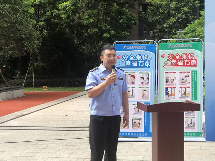 广东菱越电梯有限公司维保区域经理赖乙桂进行乘梯知识讲解。