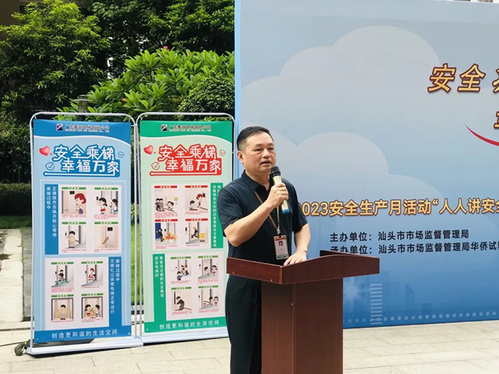 参加本次活动的领导有:汕头市市场监督管理局特监科黄坤明科长、陈楚伟副科长;汕头市市场监督管理局华侨试验区分局张江涛局长、黄闪烽副局长、四级主办蔡伟锐同志;广东省特种设备检验研究院汕头检测院余锦标主任;汕头特种设备协会卢愈钦秘书长;广东菱越电梯有限公司孙洪建副总经理、维保经理林瑶绵;怡轩壹品湾(三区)物业服务中心吴昕晟经理、怡轩壹品湾工程部青明志经理。