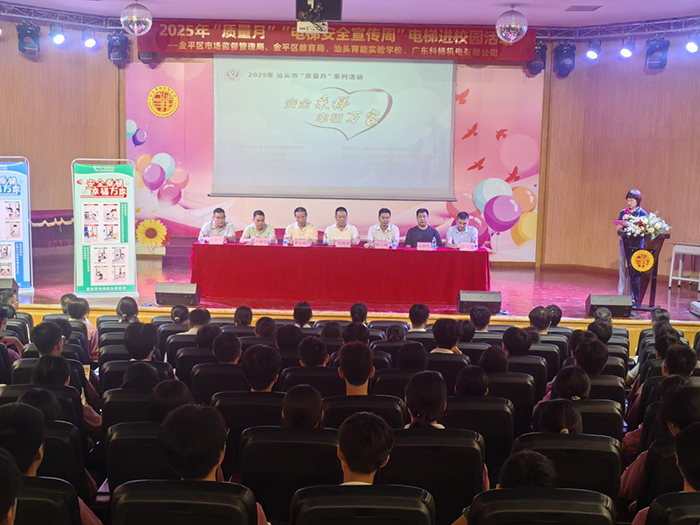 为贯彻落实《特种设备安全法》、《广东省电梯使用安全条例》,推进我市市场监管领域“质量月—电梯安全宣传周”工作,普及电梯安全知识,增强师生电梯安全意识与应急能力,2025年9月18日下午,在金平区市场监管局的指导下,金平区教育局、汕头育能实验学校、汕头市特种设备协会、广东科畅机电有限公司等单位联合在汕头育能实验学校开展以“安全乘梯 幸福万家”为主题的宣传教育及“人人讲安全,个个会应急”的电梯困人应急演练活动。