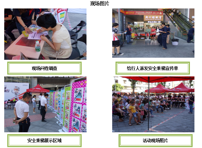 8月2日上午,这炎炎的夏日,我们现场的工作人员顶着头顶上太阳从早上9点马不停蹄一直做到中午11点多,才把宣讲的会场布置完毕,结束时每一个人仿佛洗了澡般,浑身湿漉漉的。经过中午短暂的休息,下午1点开始,我们分出几个小组为下午的宣讲活动开始进行现场宣传,有的派发传单、有的在做调查问卷、有的为路过的行人宣传安全乘坐电梯的知识。到了下午三点活动正式举行了,在现场主持人的带动下, 我们观看了安全乘坐电梯的视频,并在观看视频的休息时段开展宣传搭乘电梯安全知识的小游戏活跃现场气氛, 《大家来找错》这个小游戏是现场挑选小朋友来找出漫画图片中的错误乘梯行为。整个宣讲会的现场气氛越来越好,过往的人也越来越多的停下脚步观看。直到下午五点,活动圆满结束了。