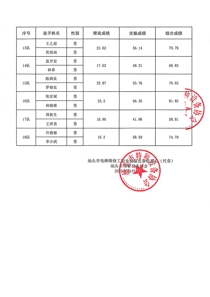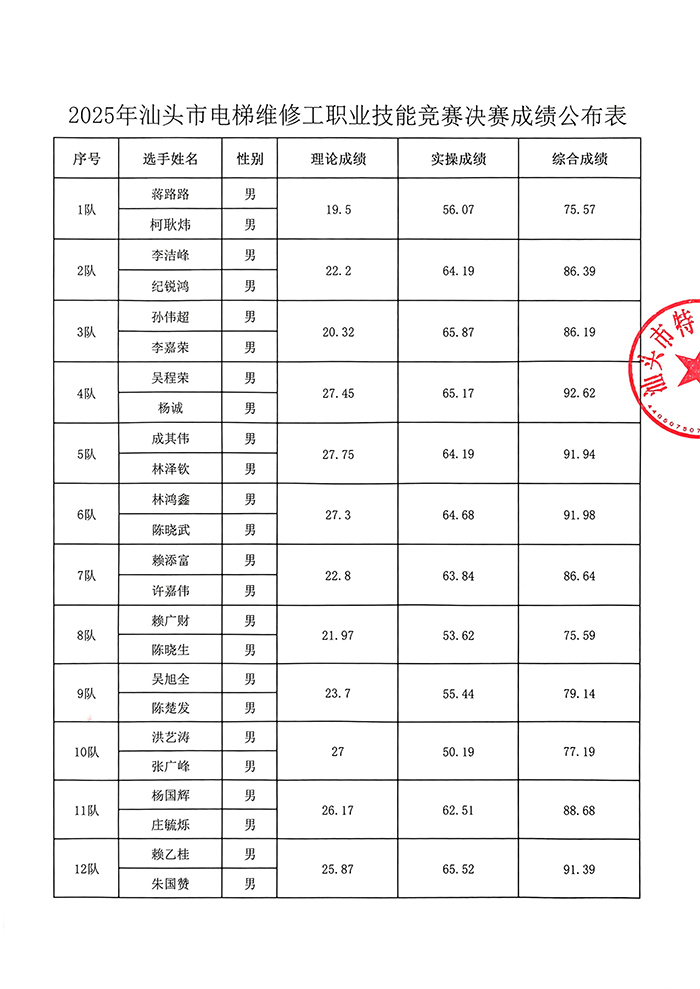 2025年汕头市电梯维修工职业技能竞赛决赛成绩公布表